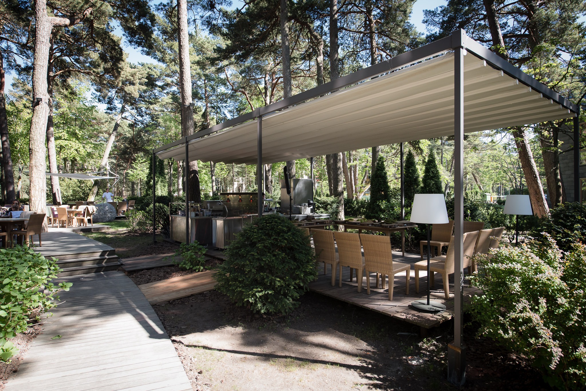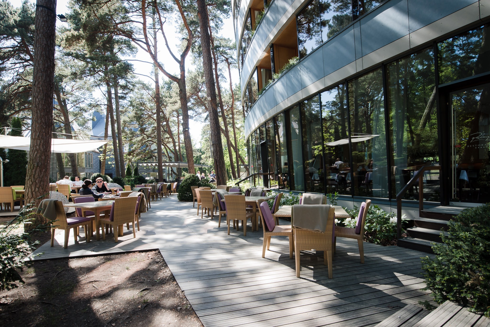 ERDVĖ. Restorano interjeras dekoruotas natūralia tiko mediena ir egzotiškais augalais, siekiant sukurti lengvą kurorto atmosferą. Pro panoraminius langus atsiveria pušynas. Jis ir yra kas sezoną besikeičianti ir nepamainoma šio restorano interjero „puošmena“.